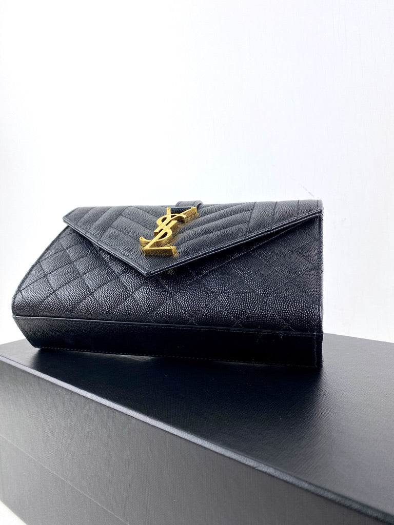 Saint Laurent - ENVELOPE SMALL IN QUILTED GRAIN DE POUDRE EMBOSSED LEATHER. (Nypris 16.158 kr/2.165 Euro på Saint Laurent´s hjemmeside 5. Nov 2023). Tasken er Købt i marts 2023 for 14.550 kr/1.950 Euro). Kvittering, Dustbag og æske medfølger. Tasken er kun brugt sparsomt. Standen er god med lidt brugsspor. Se billeder. Farven er sort med guldhardware.