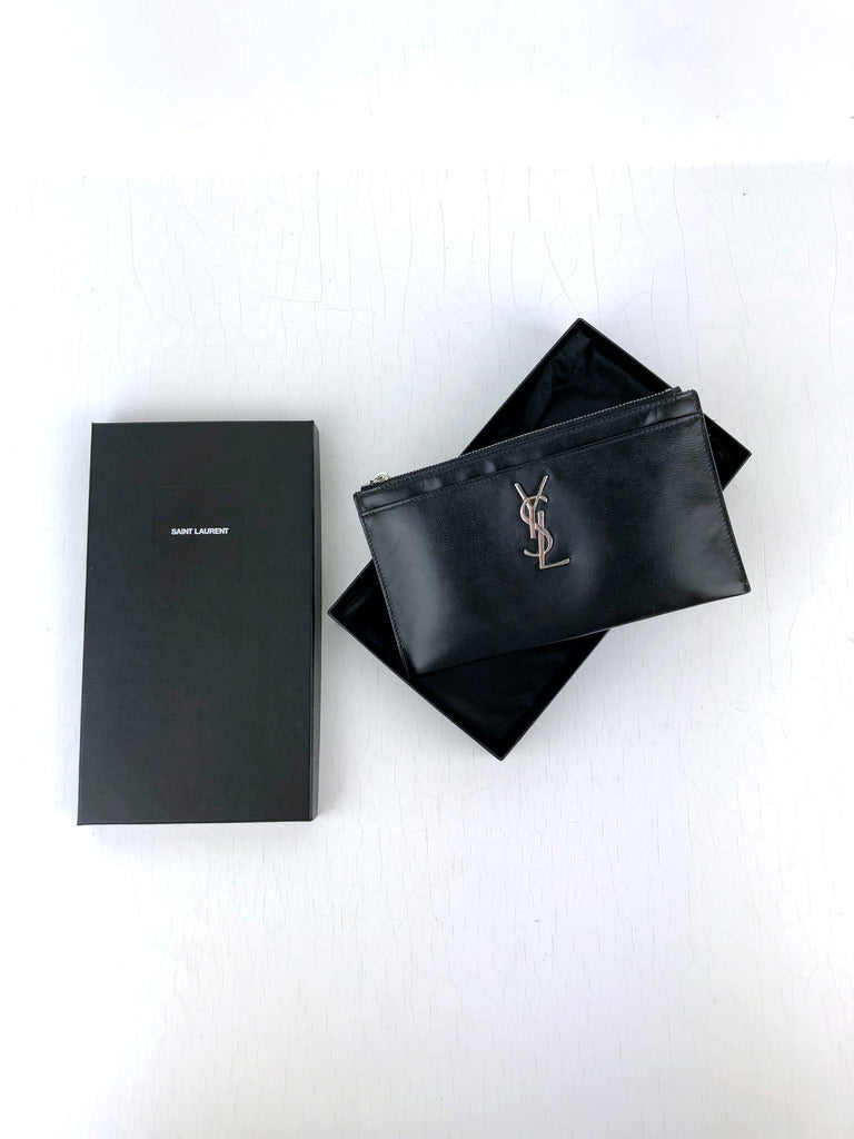 Saint Laurent Lille Clutch. Standen er god men brugt. Se billeder. Bemærk den er mere brugt end de fleste af vores varer. Prisen er sat herefter. Se billeder. Mål: L. ca 20 cm, H. ca 12 cm.